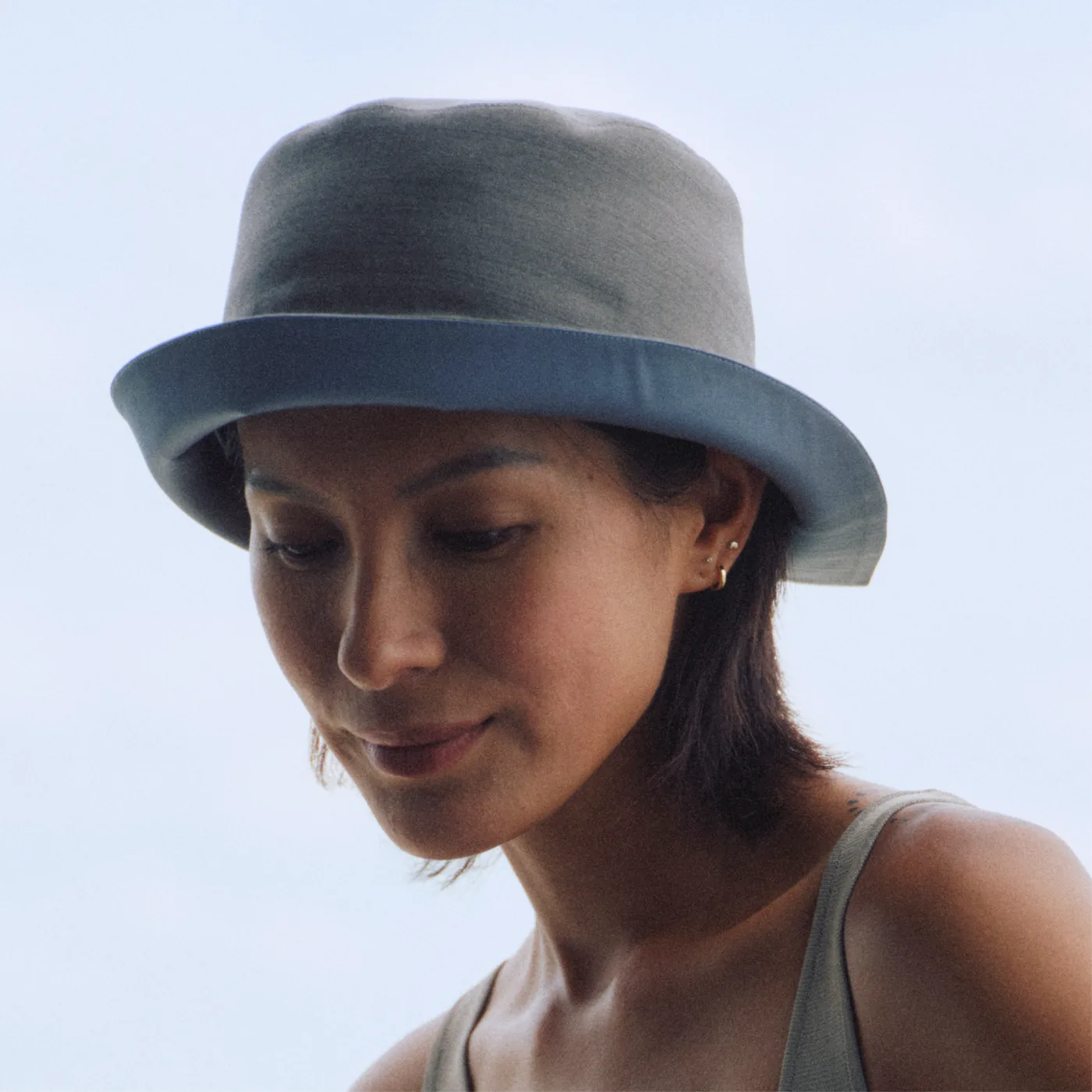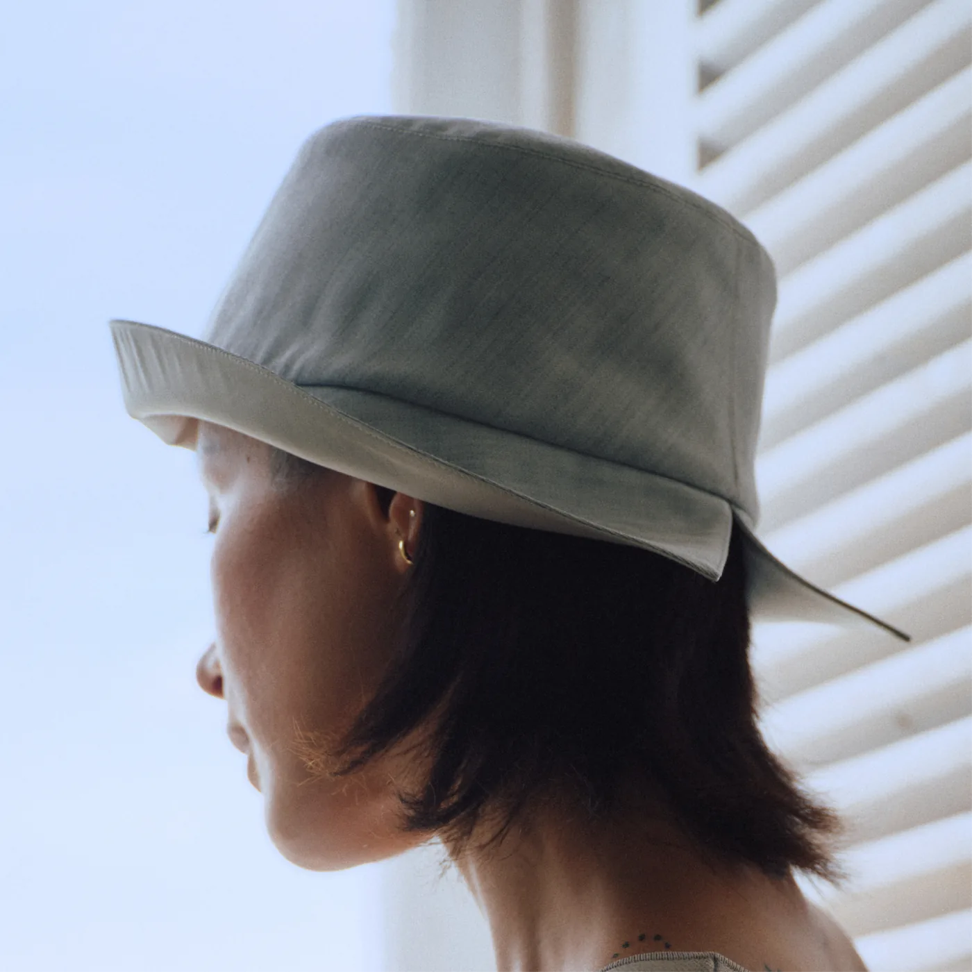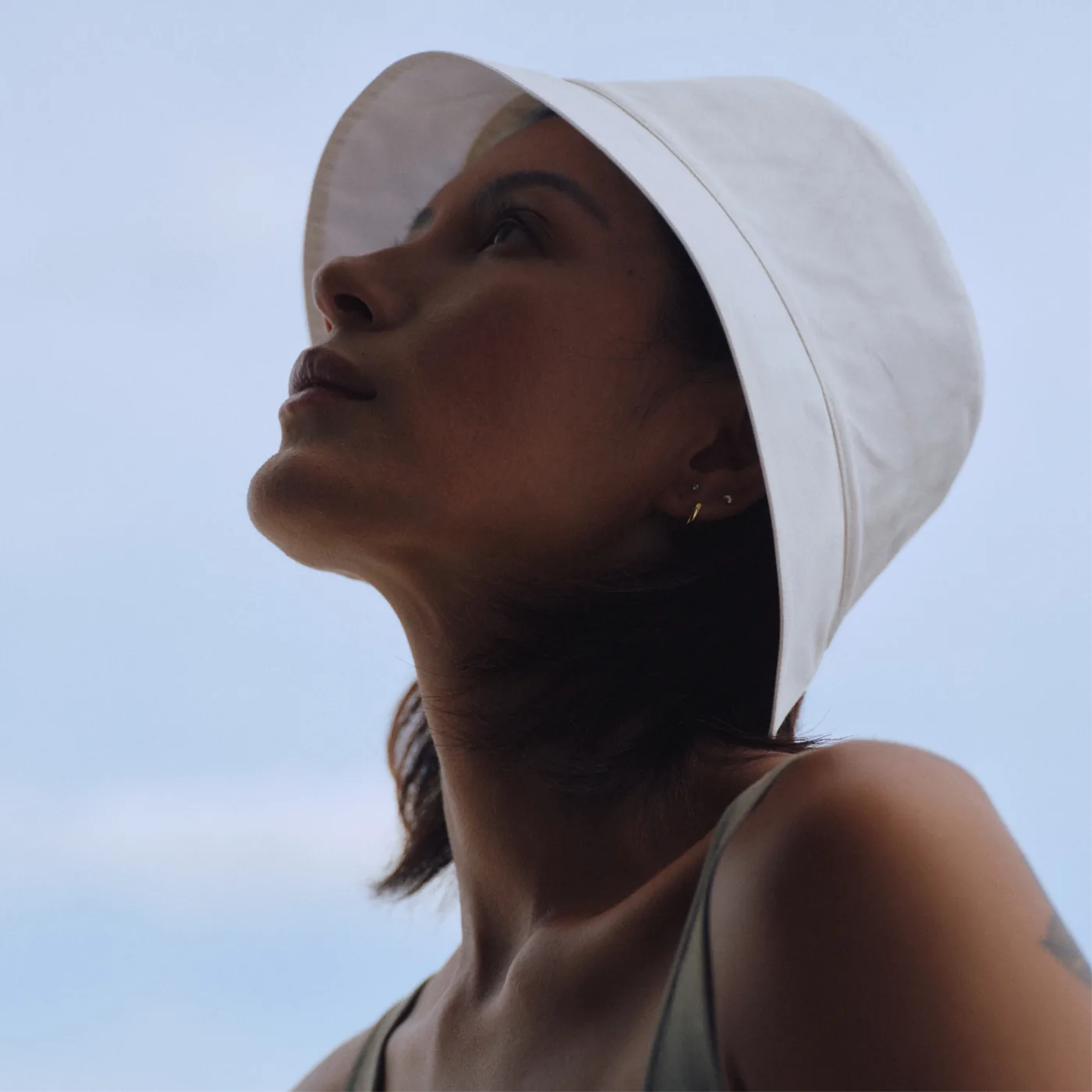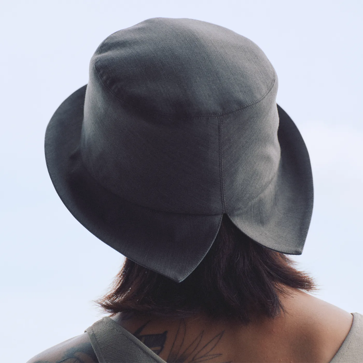 The core is a minimalist, style-agnostic bucket hat. Yet, a slit at the brim tip and a luminous panel on the underside add an echo — a subtle glint from the back, or when flipped.