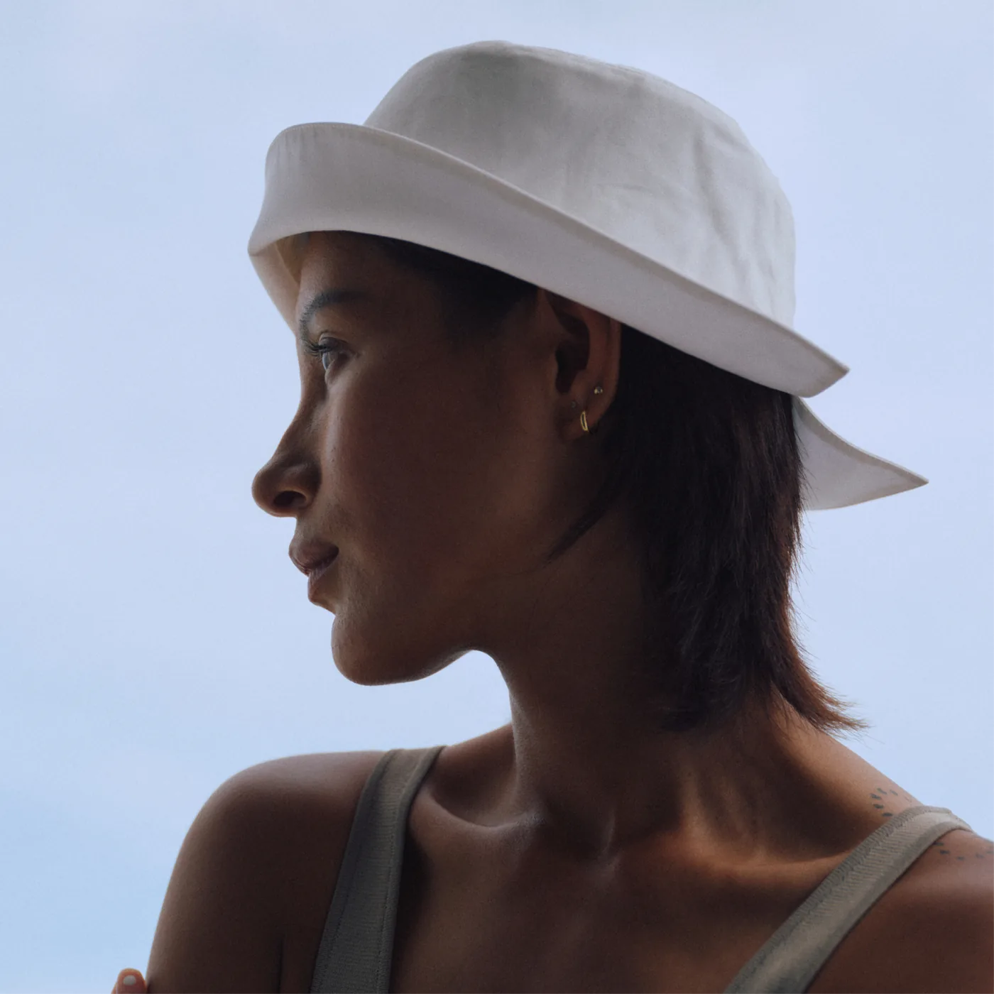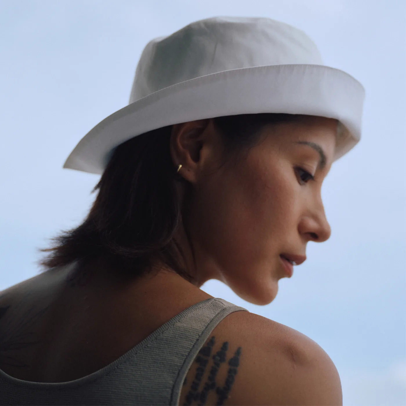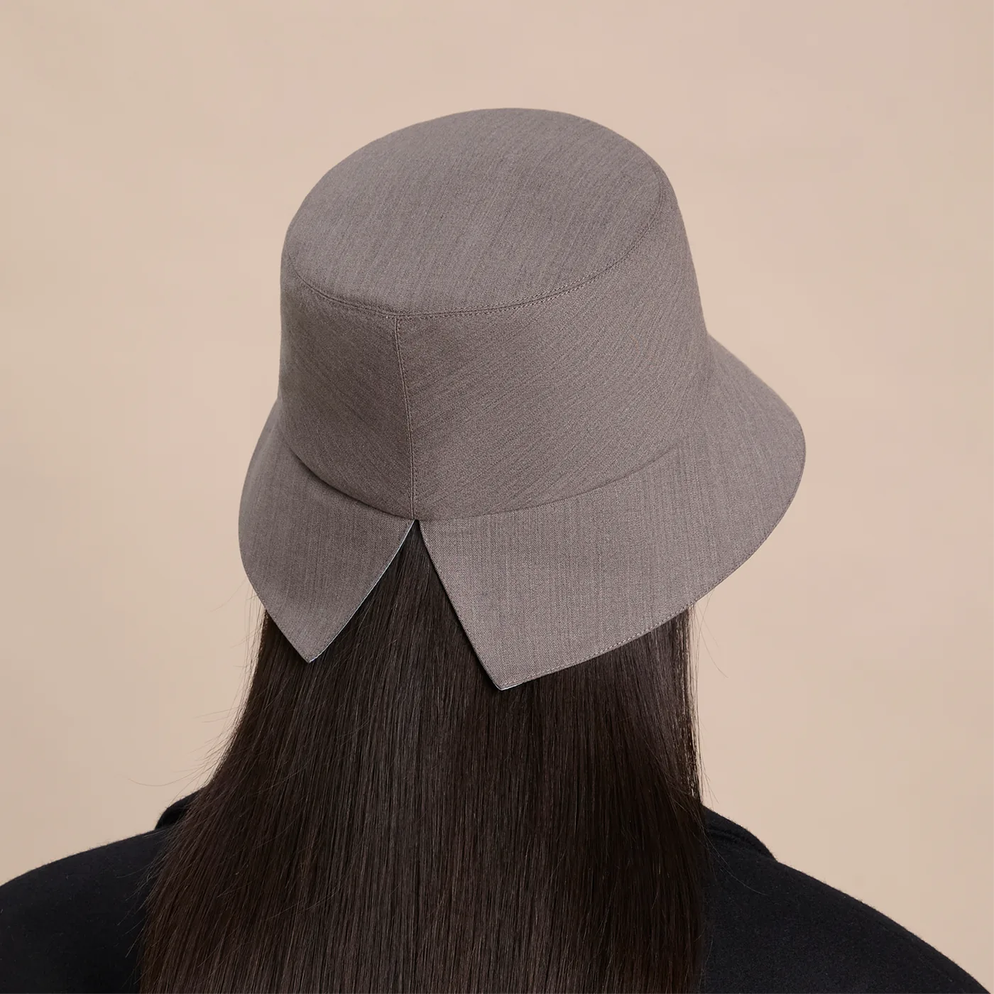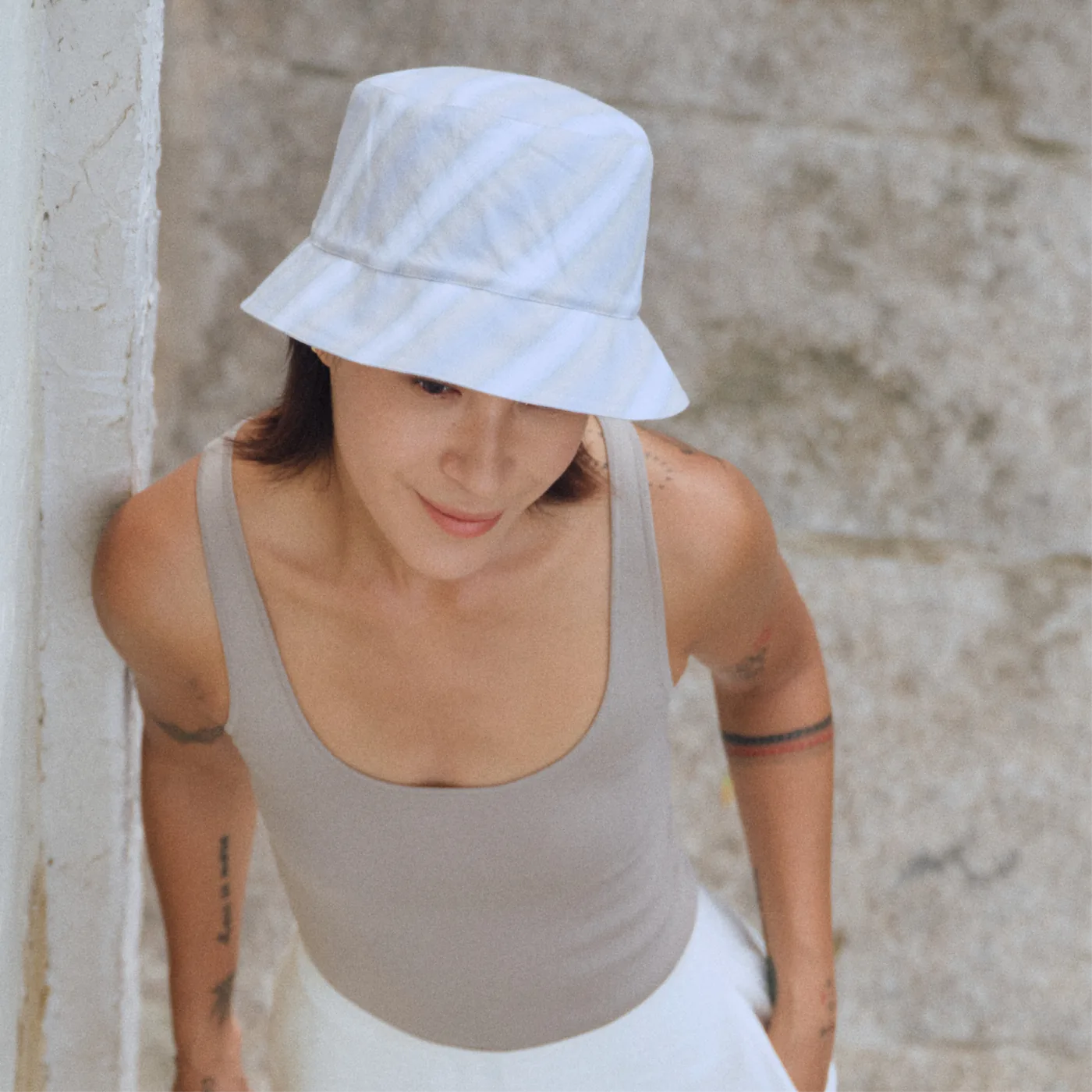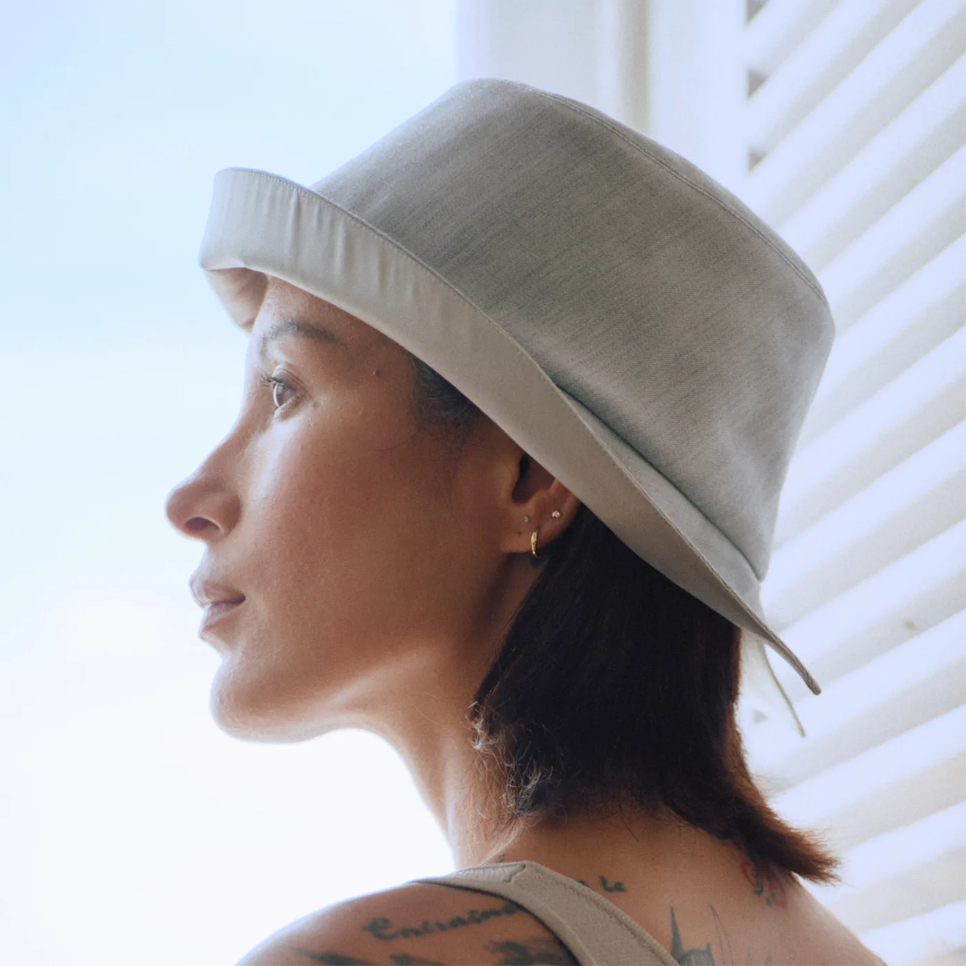 The core is a minimalist, style-agnostic bucket hat. Yet, a slit at the brim tip and a luminous panel on the underside add an echo — a subtle glint from the back, or when flipped.