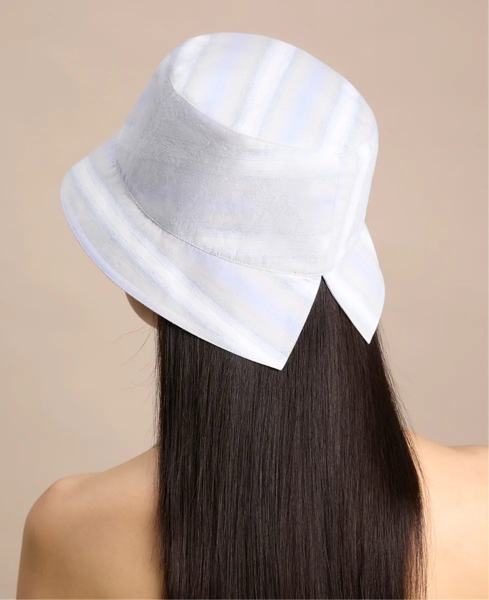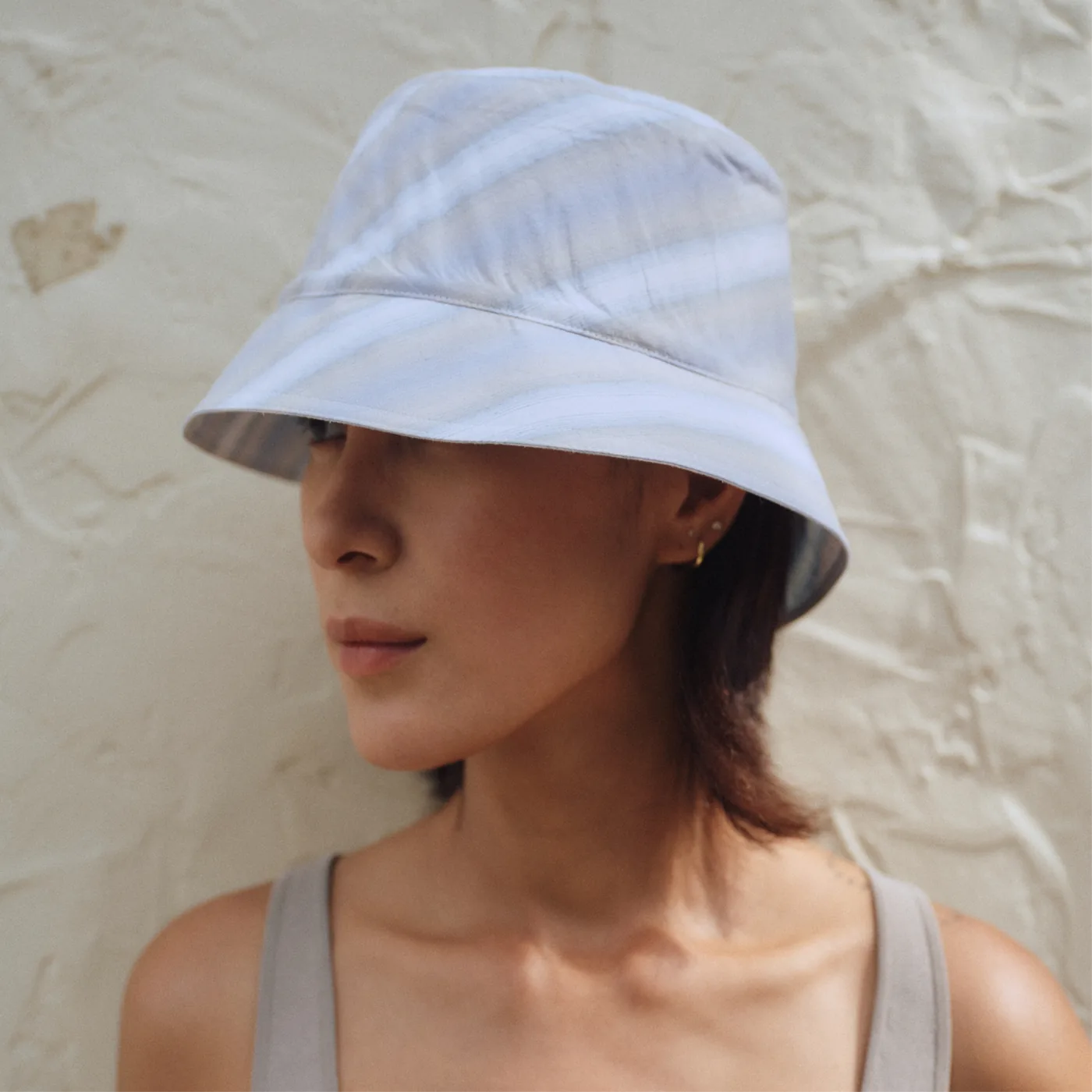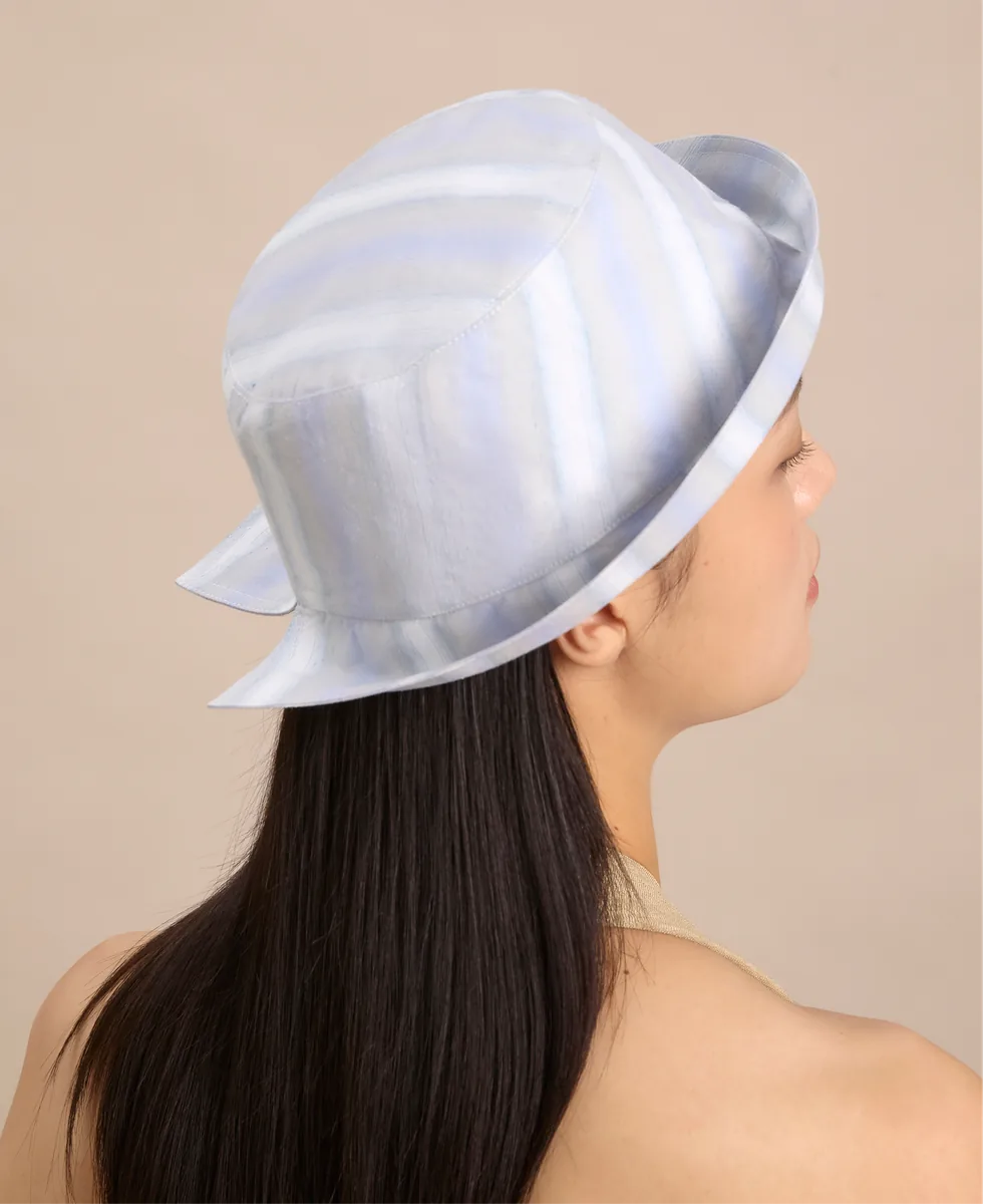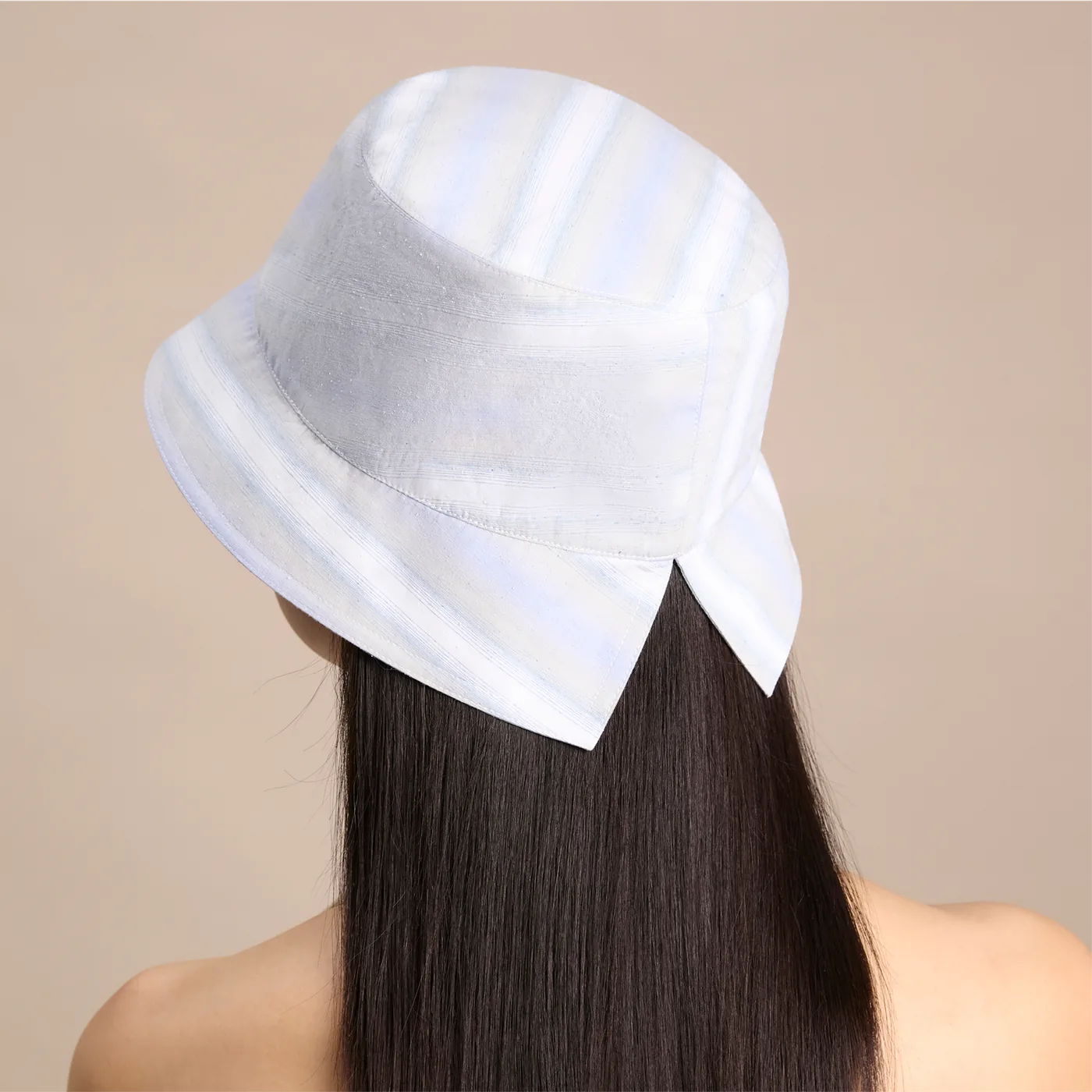The core is a minimalist, style-agnostic bucket hat. Yet, a slit at the brim tip and a luminous panel on the underside add an echo — a subtle glint from the back, or when flipped.