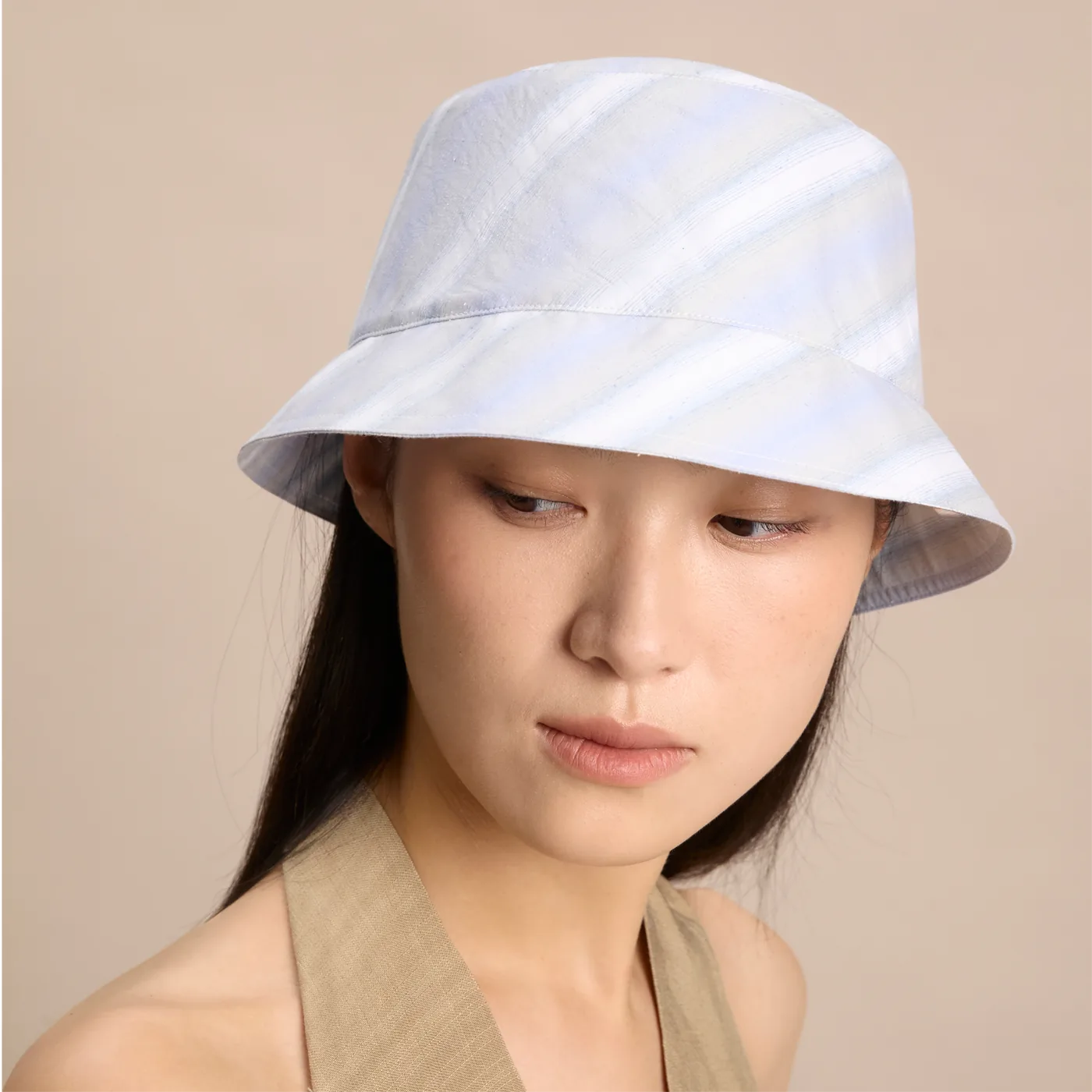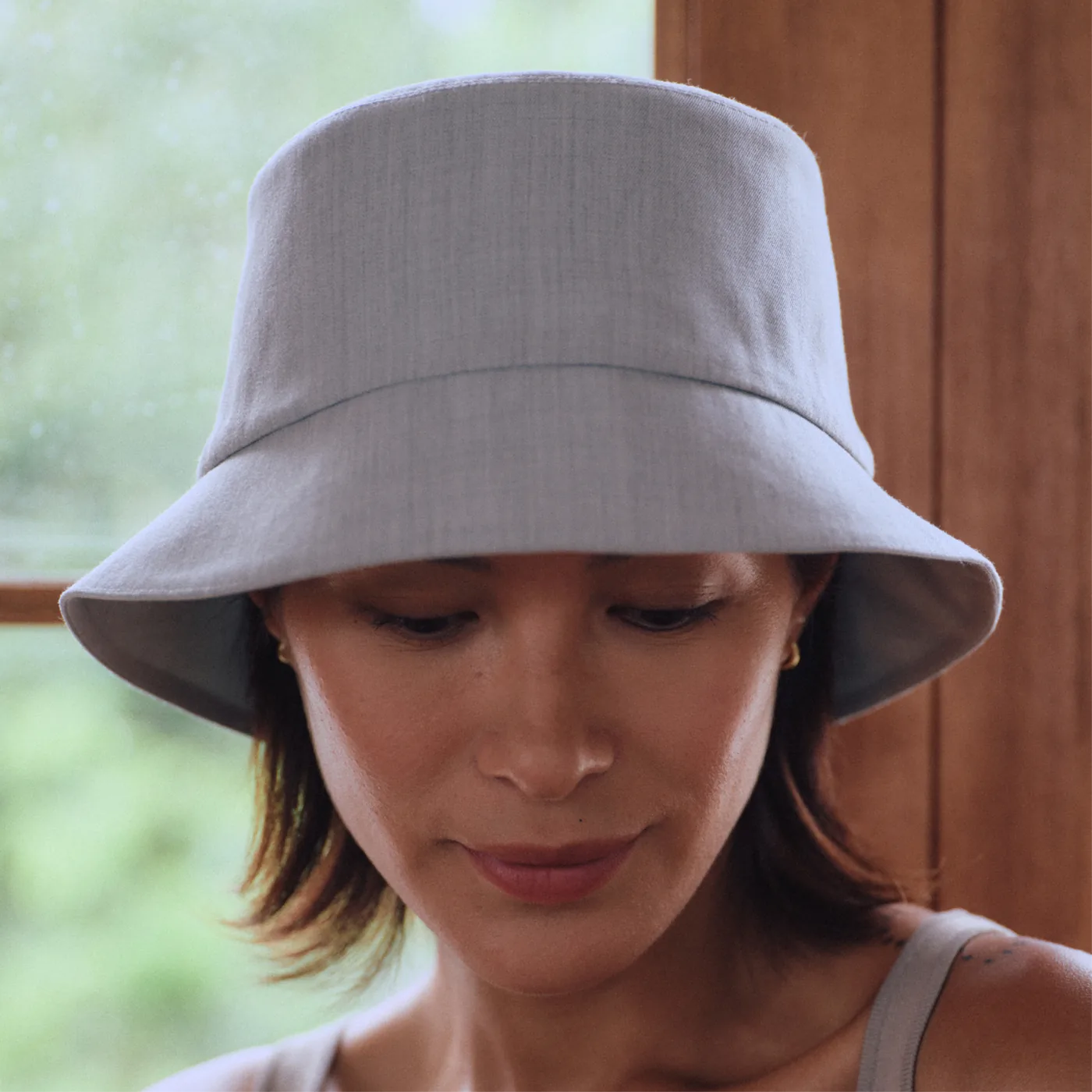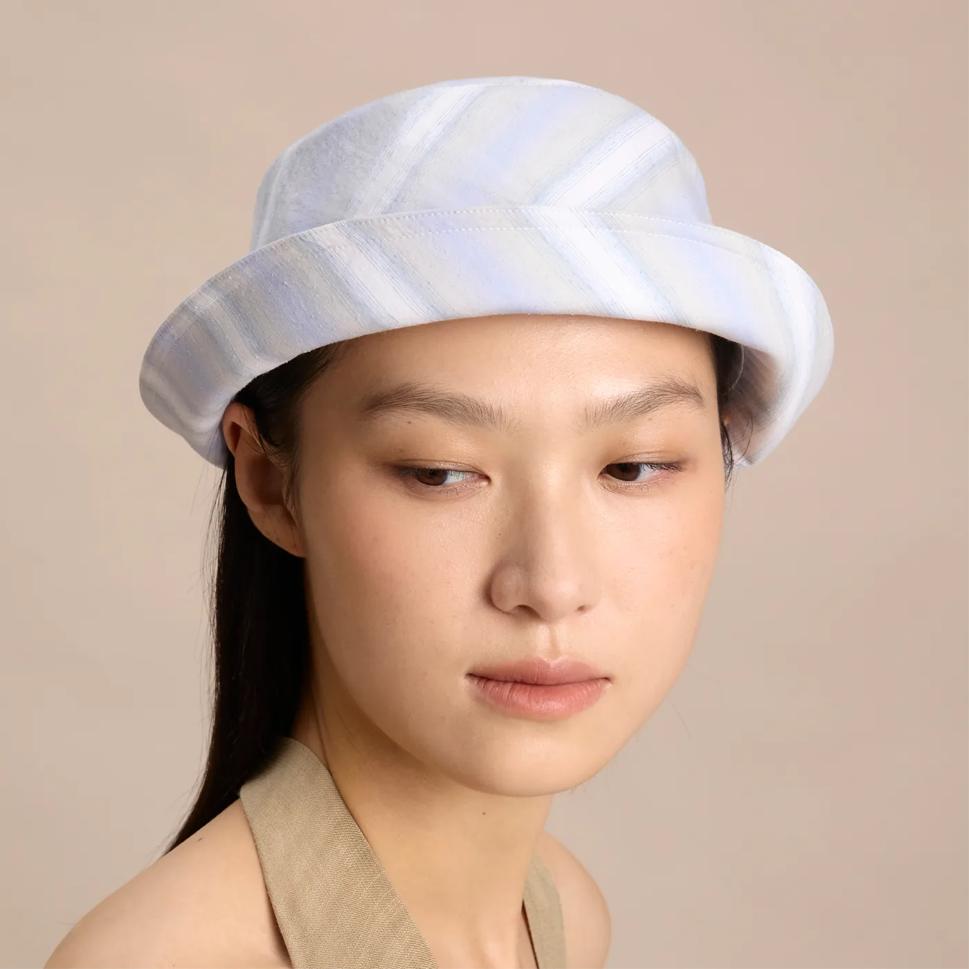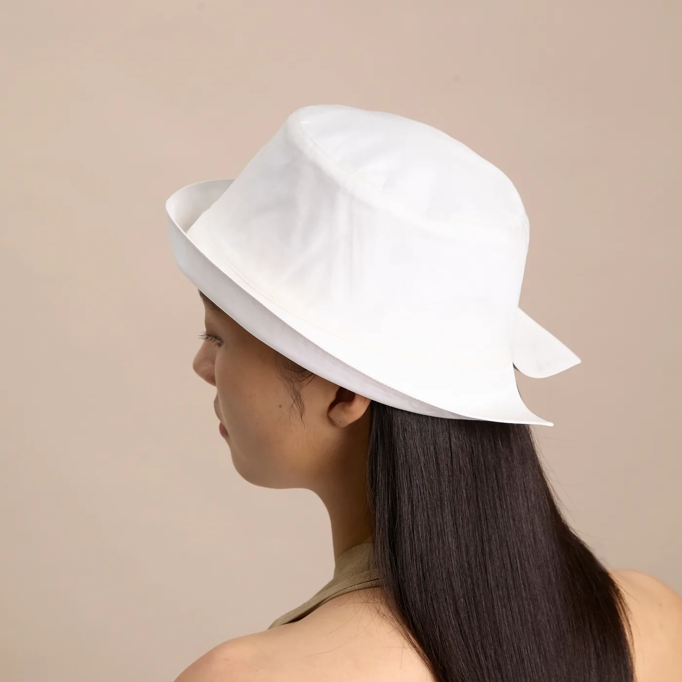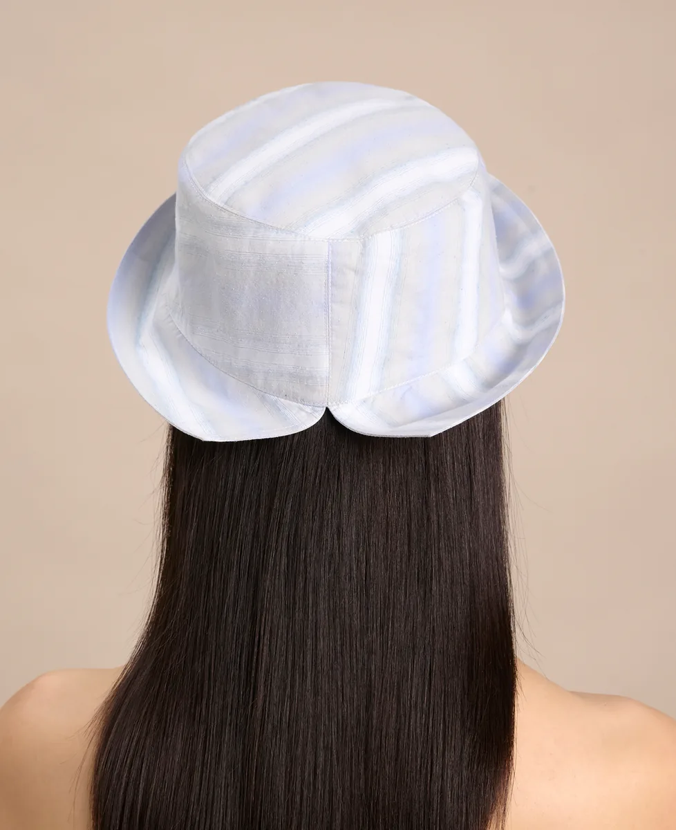 The core is a minimalist, style-agnostic bucket hat. Yet, a slit at the brim tip and a luminous panel on the underside add an echo — a subtle glint from the back, or when flipped.