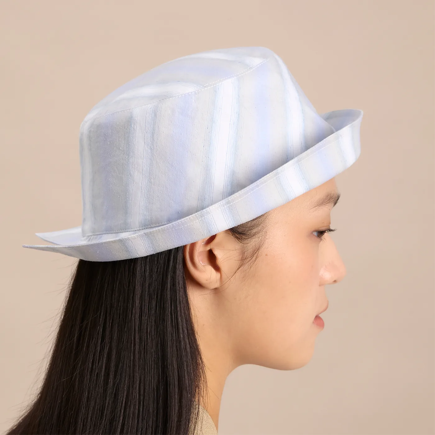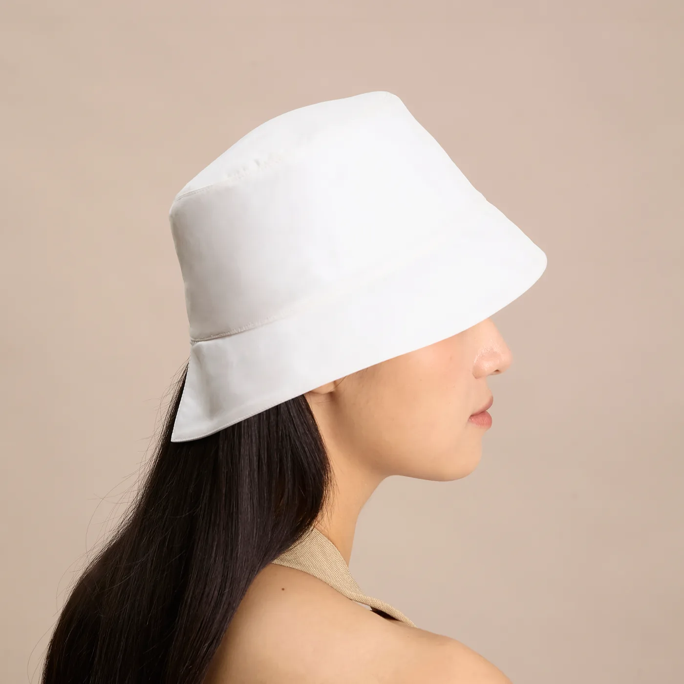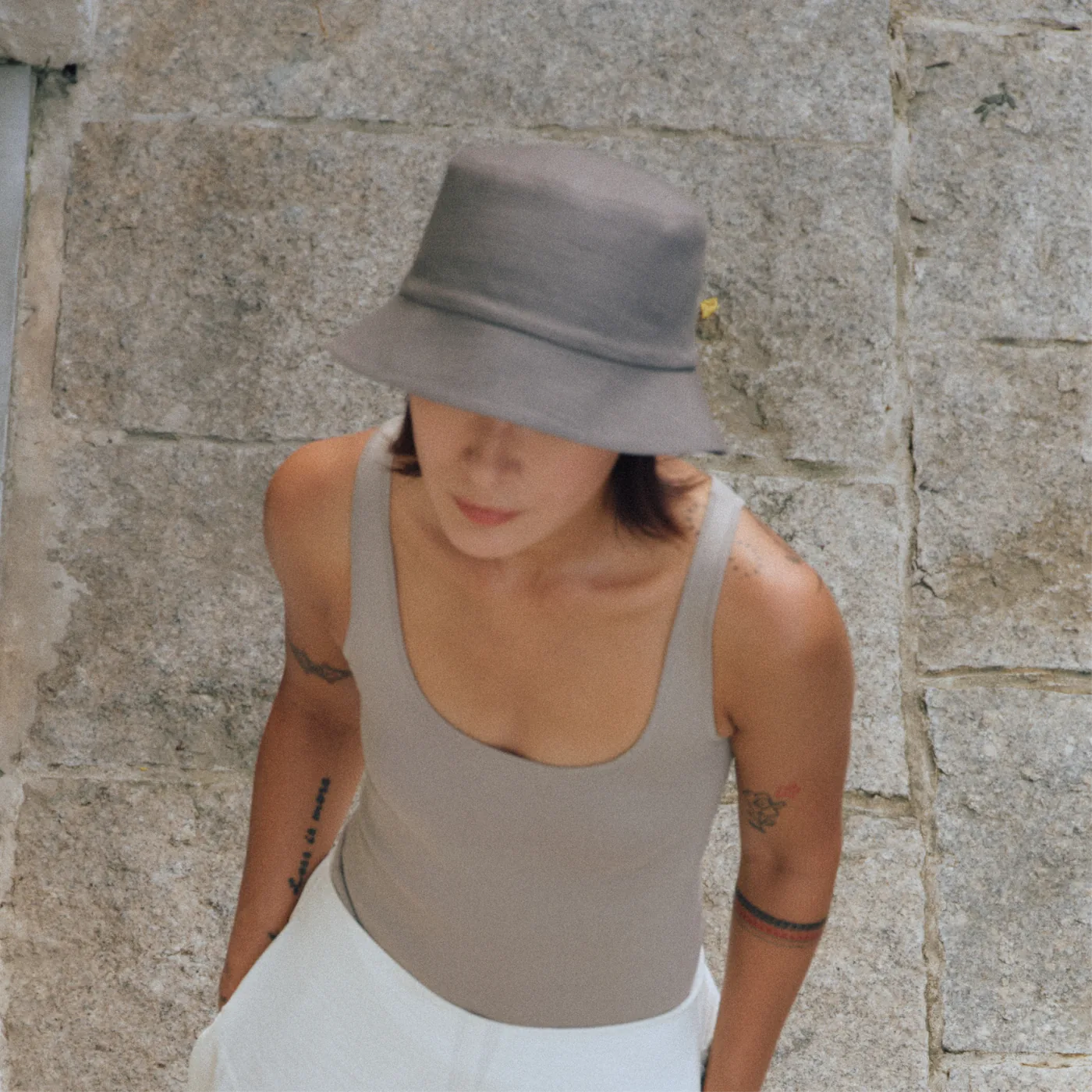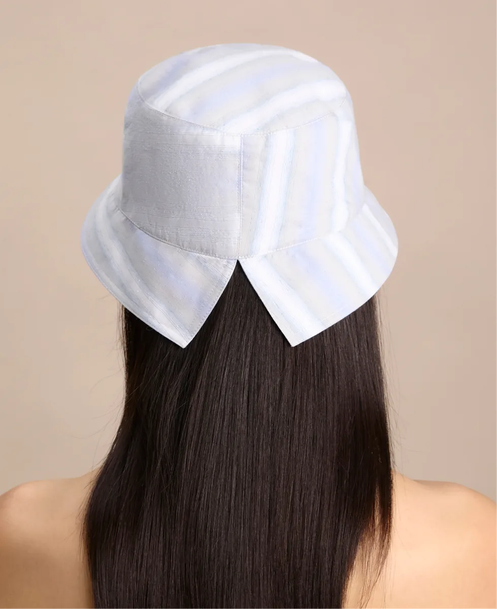 The core is a minimalist, style-agnostic bucket hat. Yet, a slit at the brim tip and a luminous panel on the underside add an echo — a subtle glint from the back, or when flipped.
