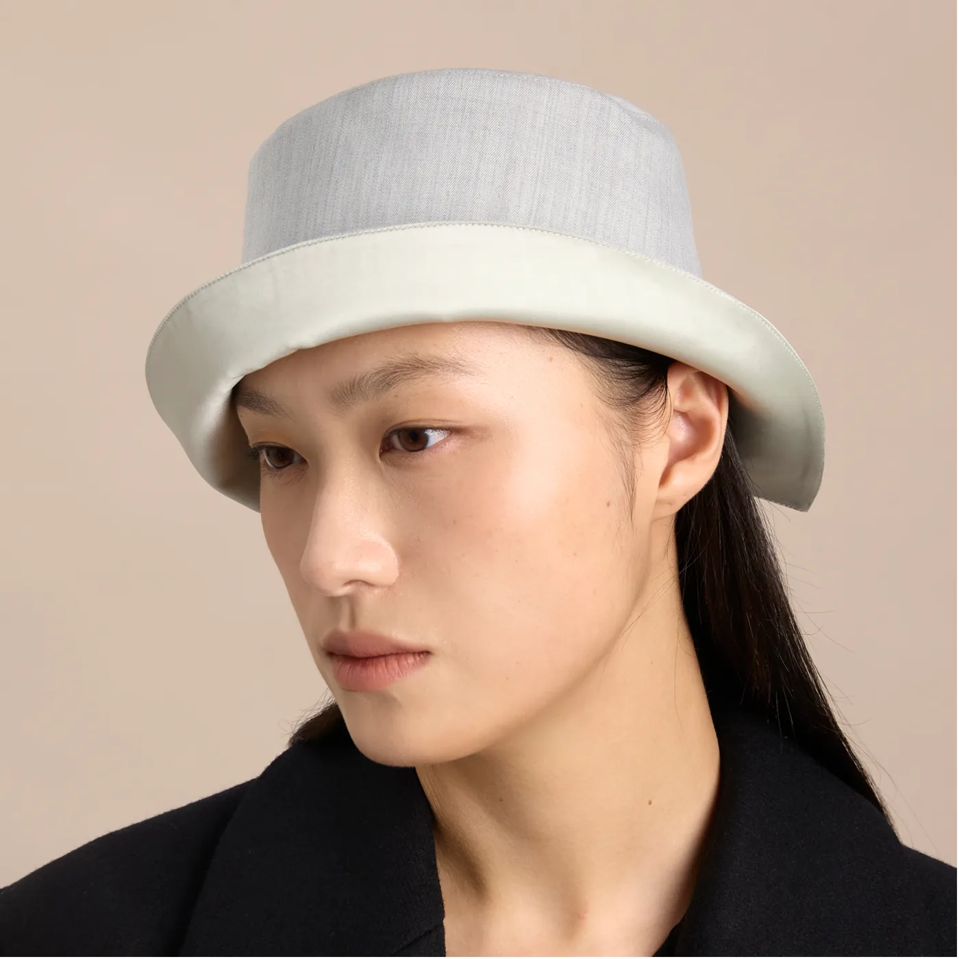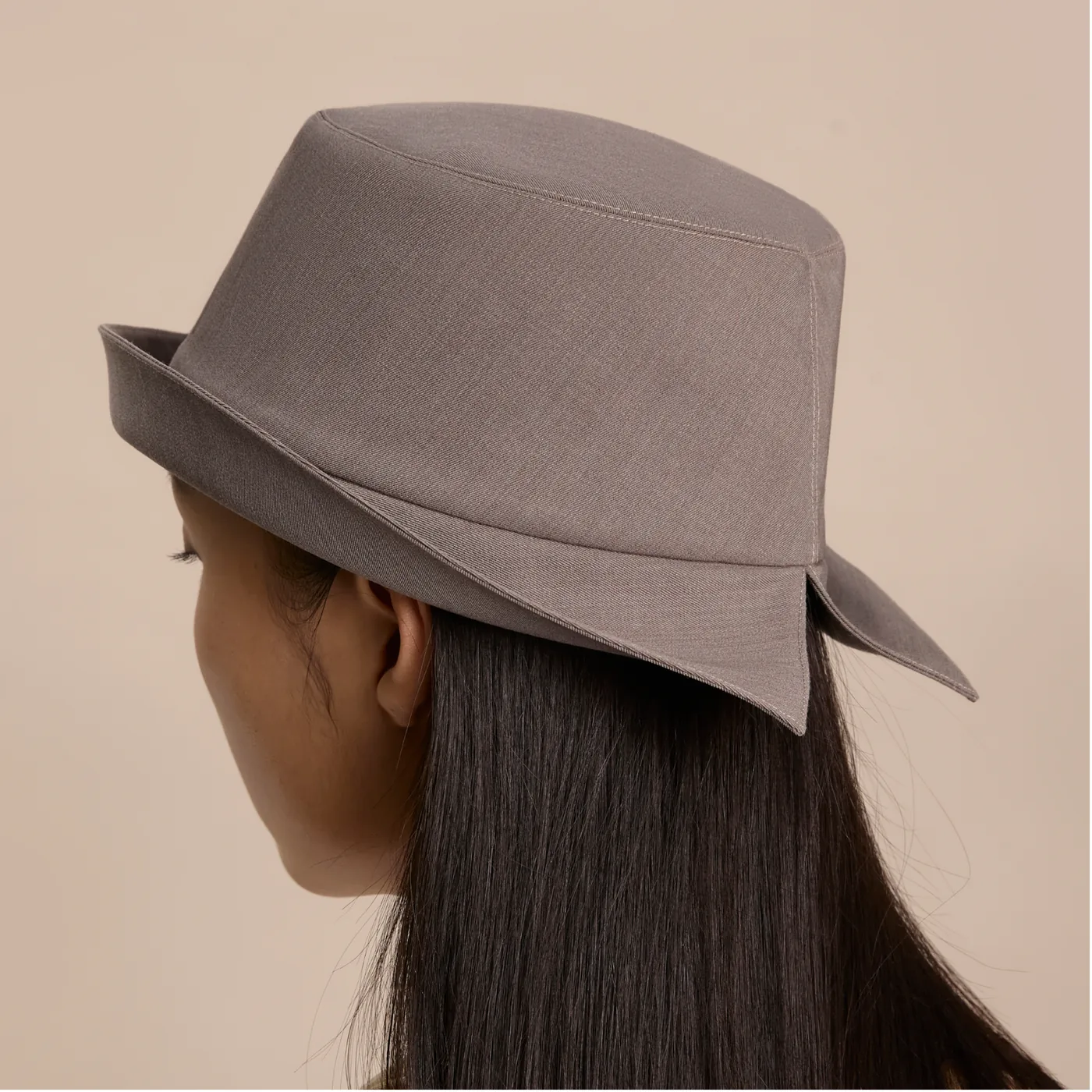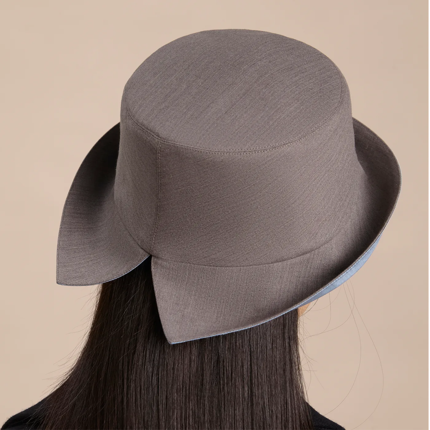 Turn the front brim outward to expose the contrasting inner fabric. Adds subtle depth and a hidden "echo" at the back, elevating your look with quiet intention.将前侧帽檐向外翻折,露出内侧帽檐材质。造型层次更丰富,将设计点睛藏于背后,为造型增加"回声"。