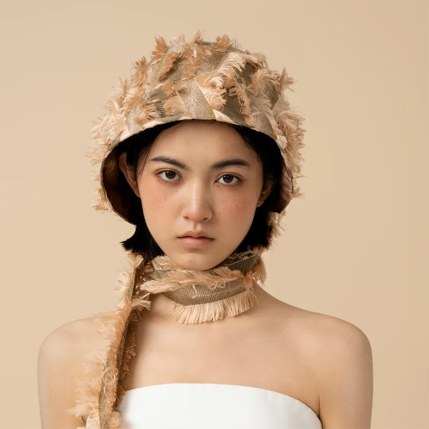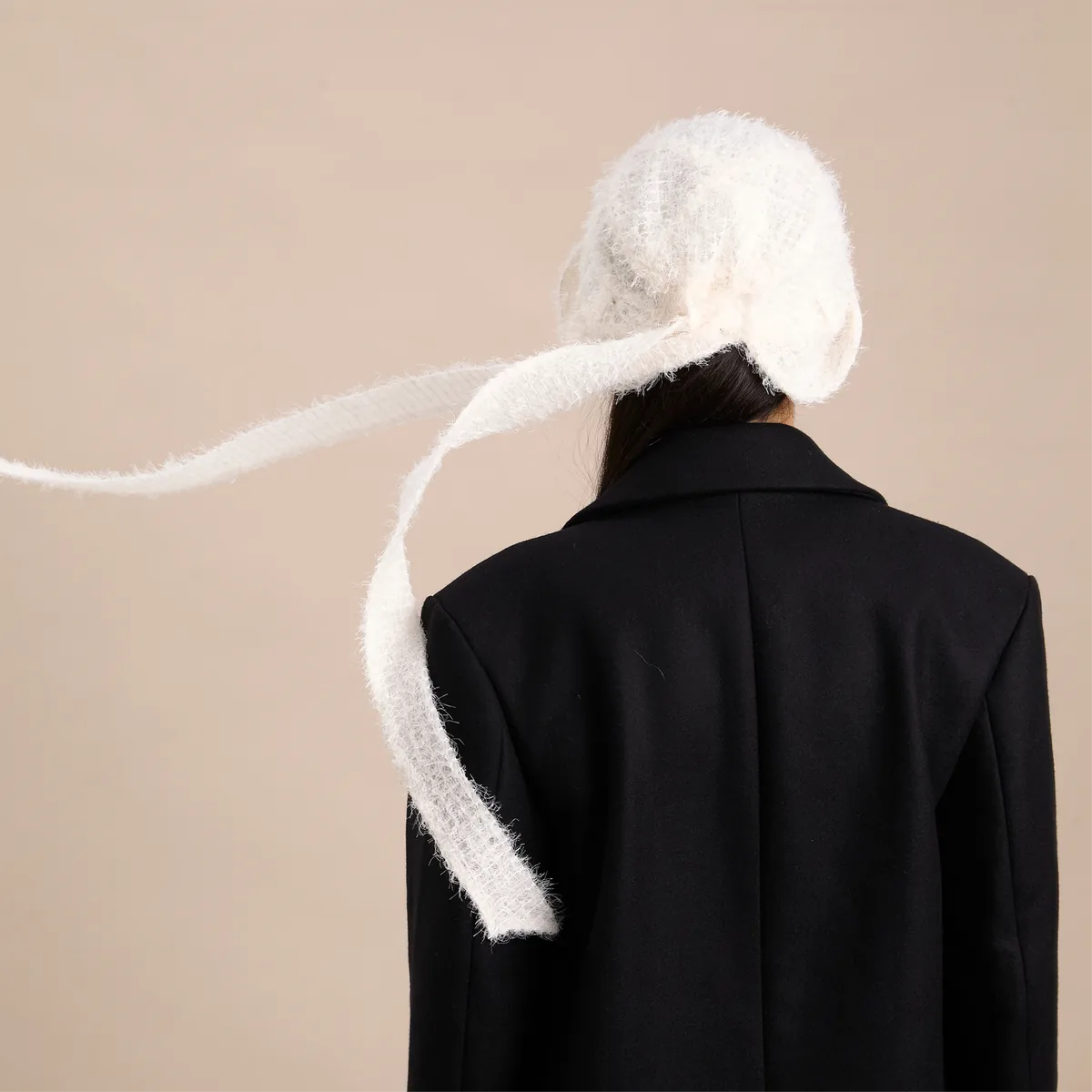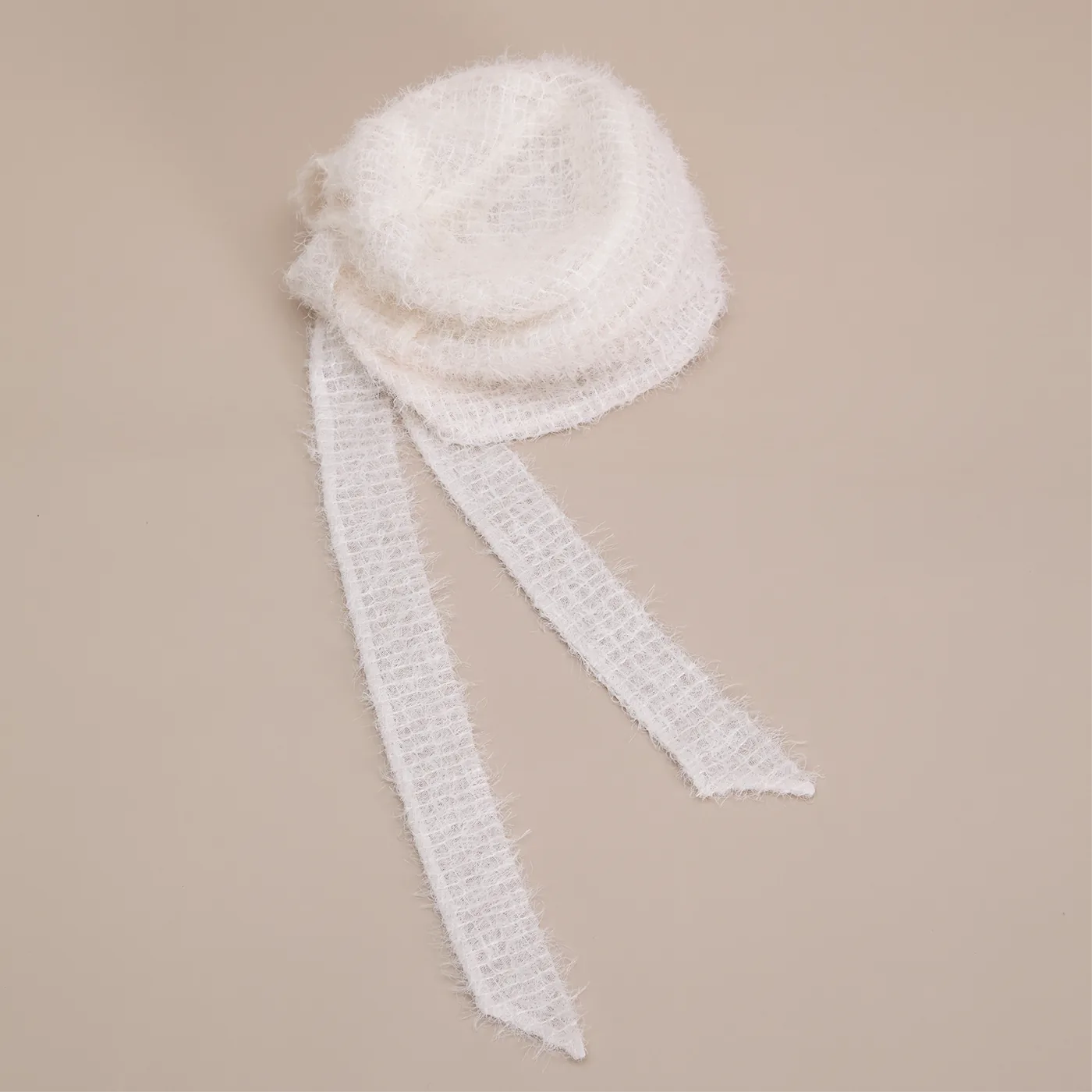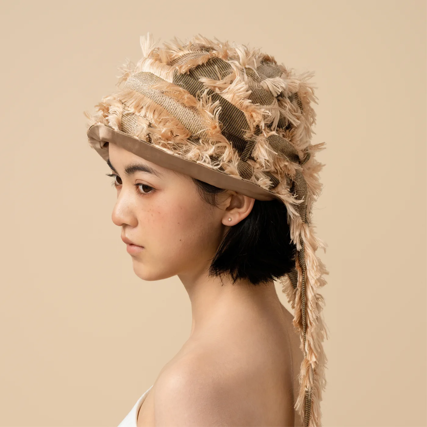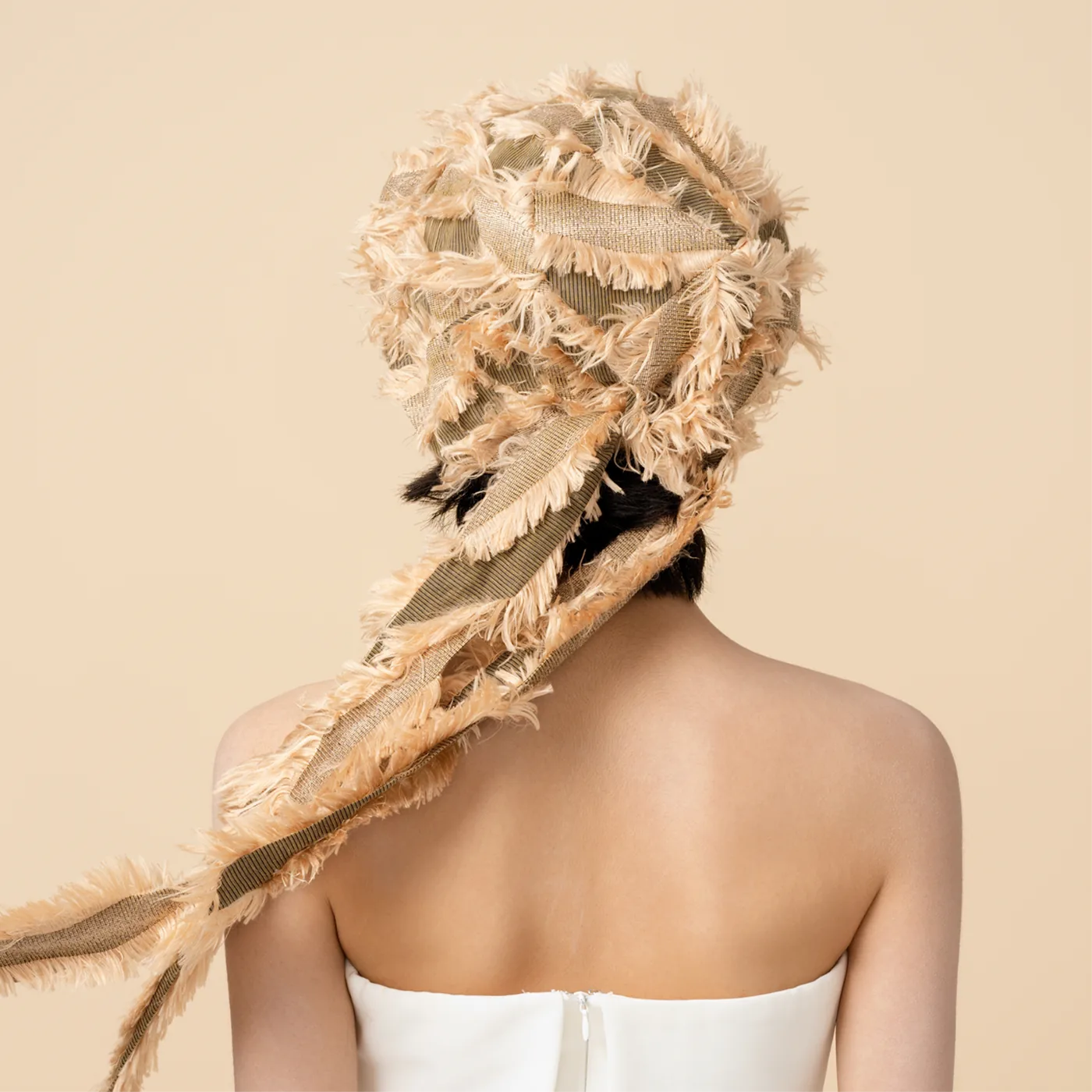 Ribbon shortened. Snug and wrapped — a defined band that hugs the crown.丝带缩短。贴合、缠绕——一条触感分明的带子环绕帽冠。