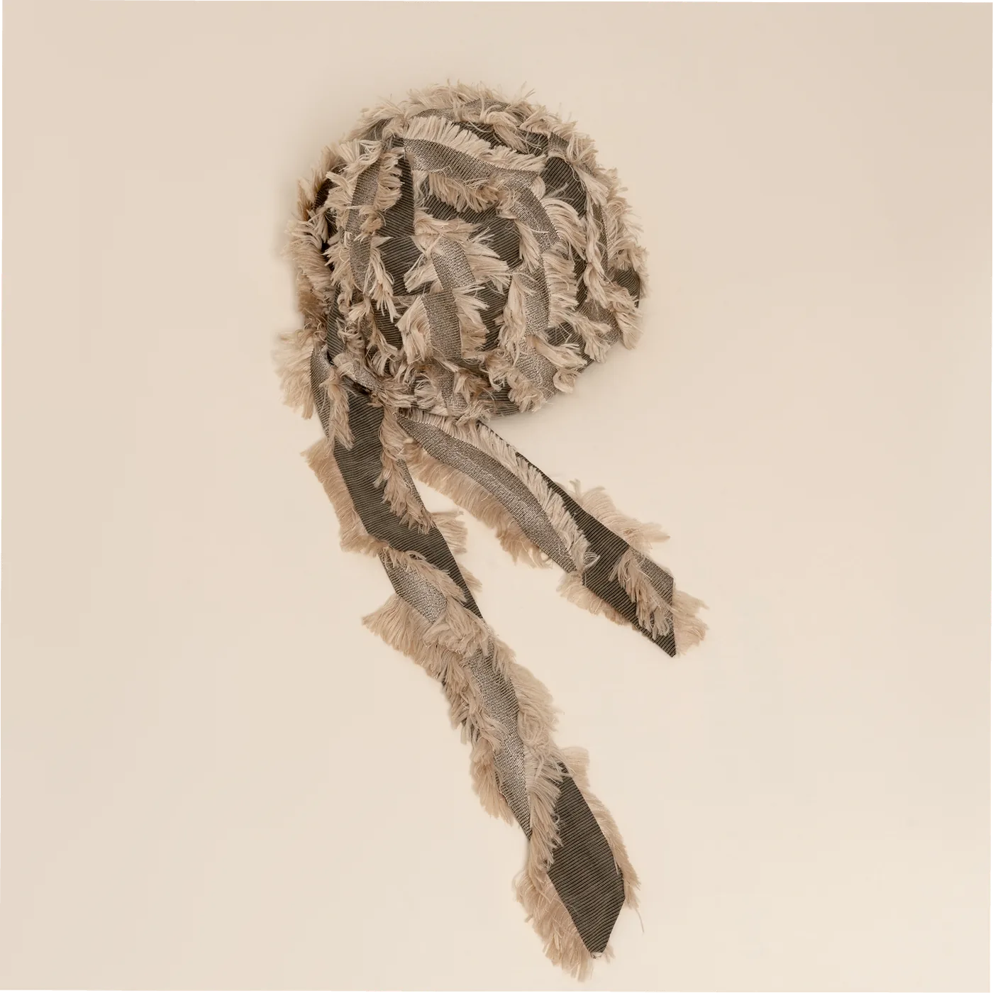 Fibers have a character; textures tell a story. The flowing ribbon is a fringe player, drifting freely between fabric, accessory, and garment.